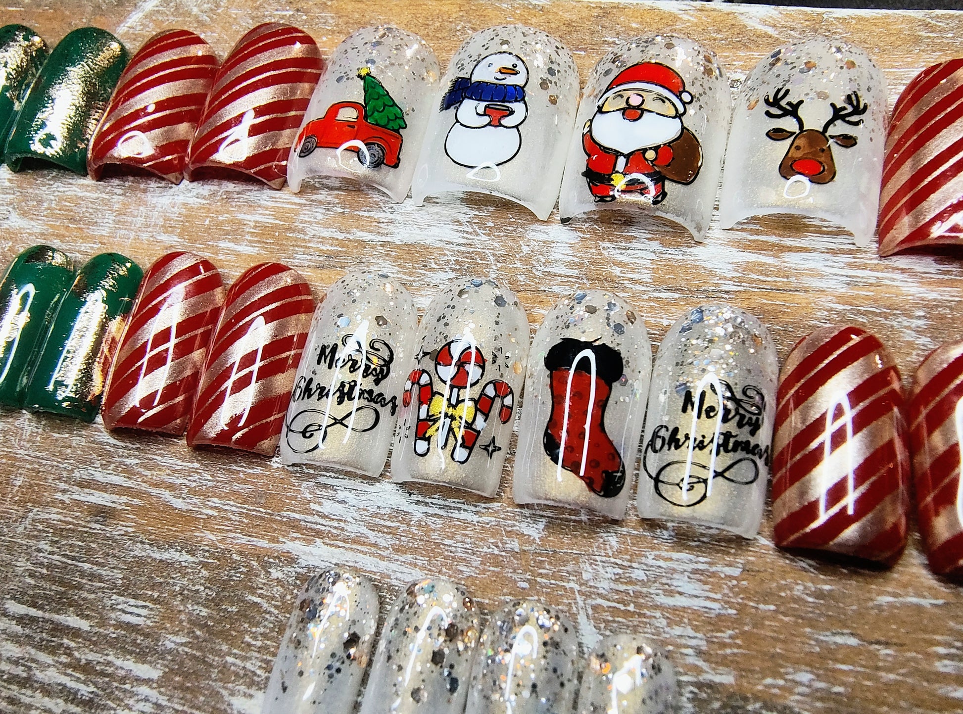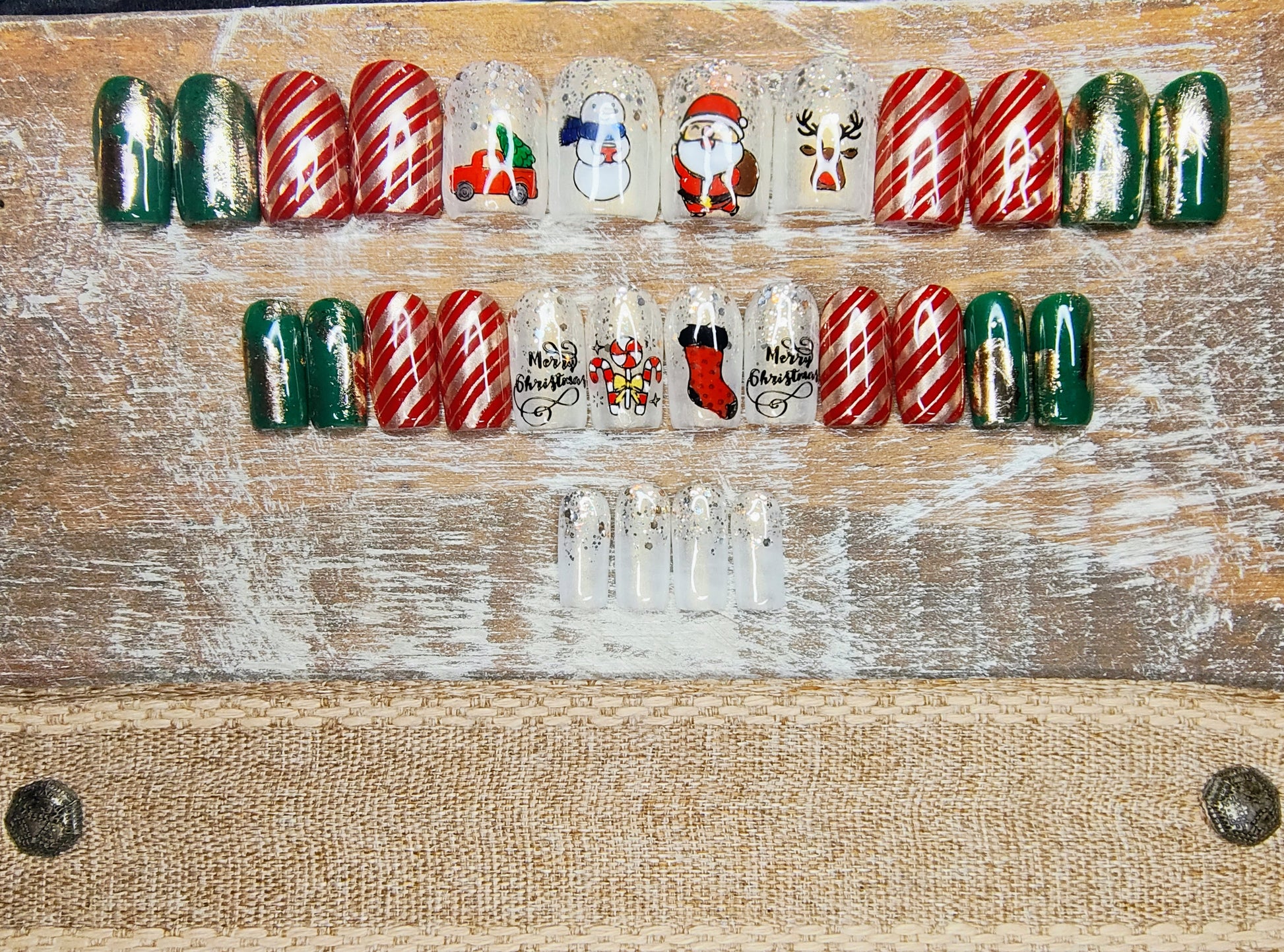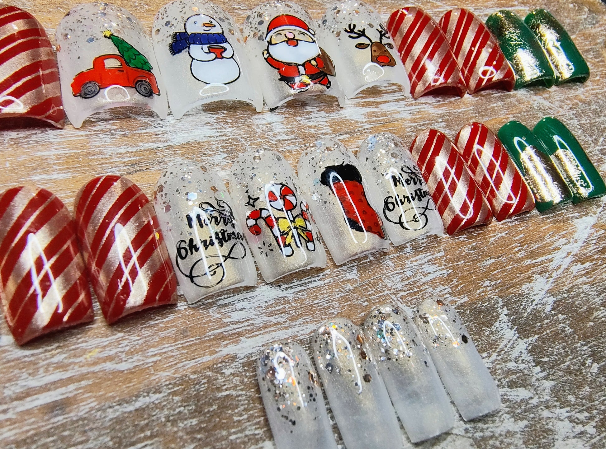 Water color nail art, pretty candy stripes, and gold abstract art make this a classical set. Perfect for any Christmas party.