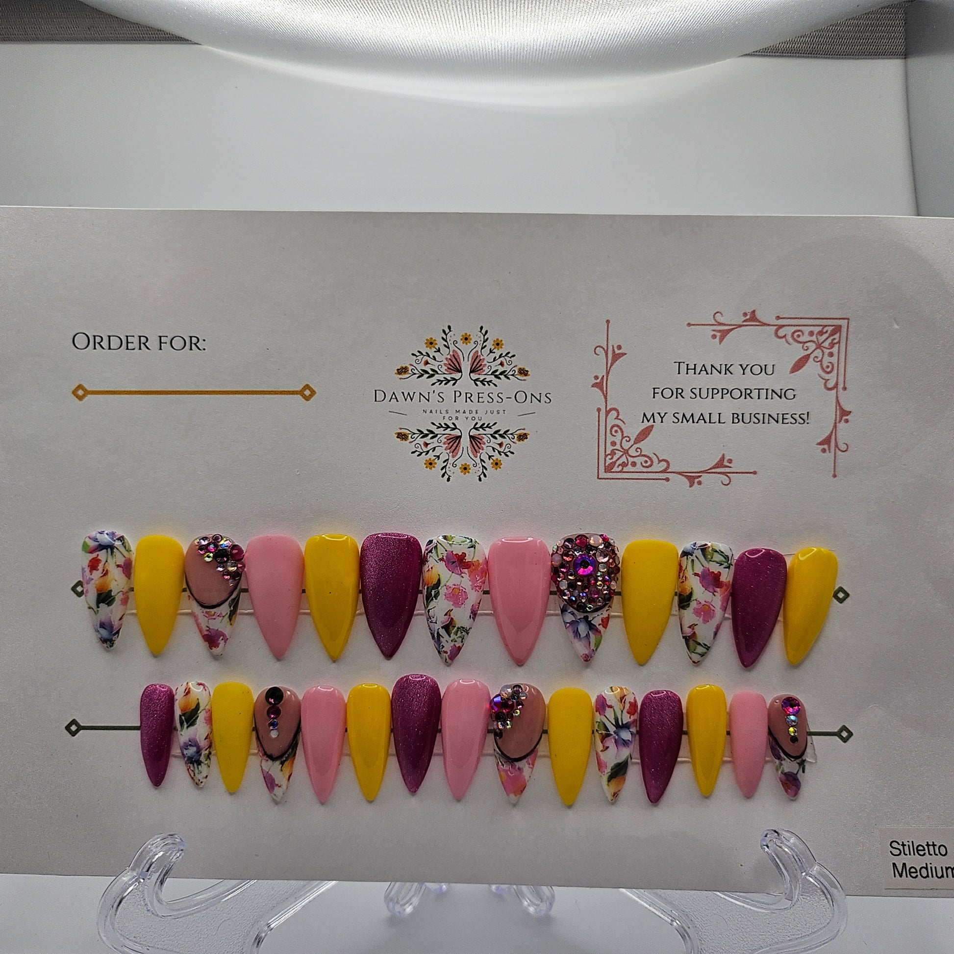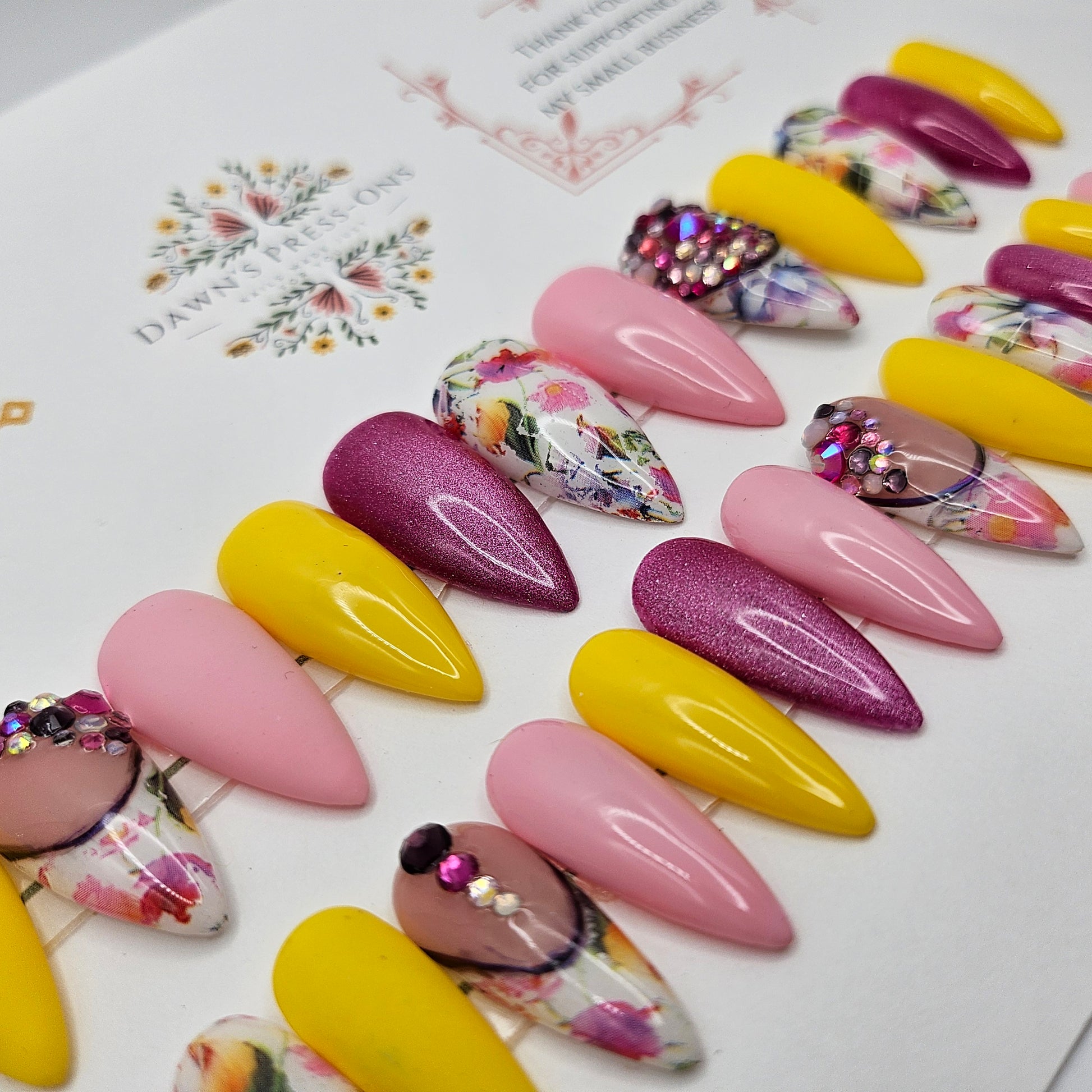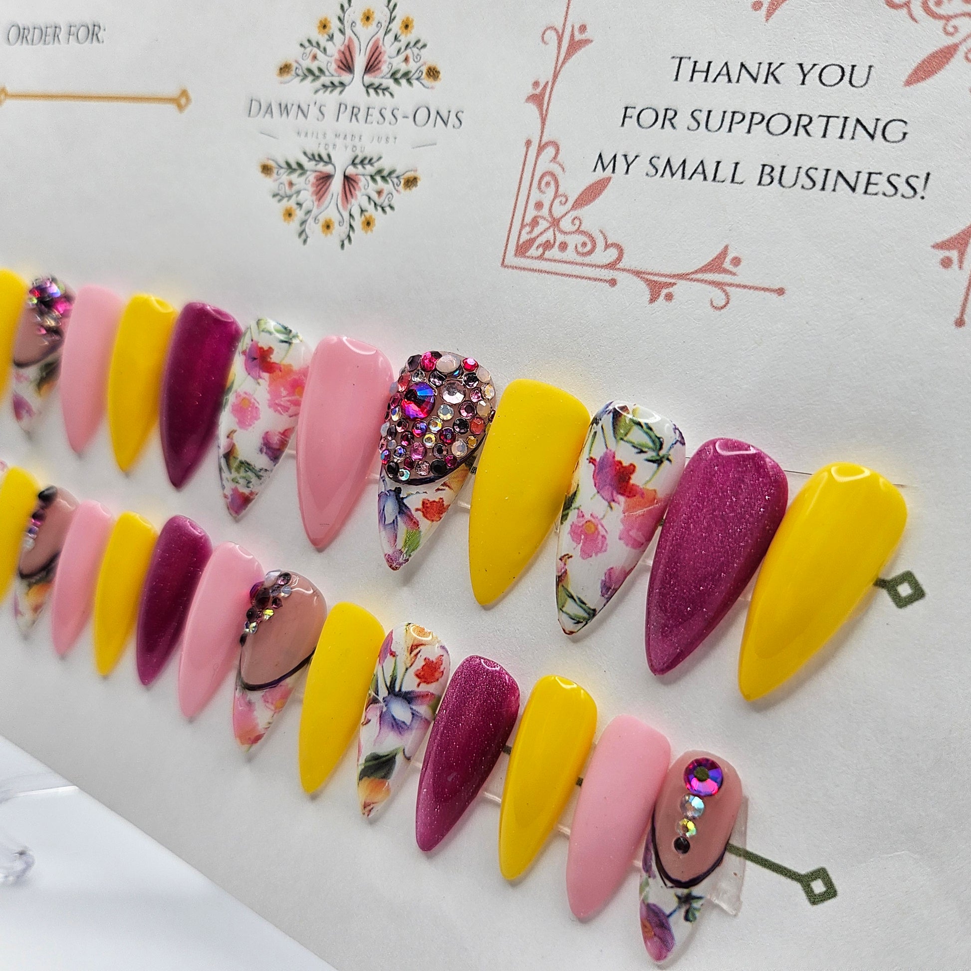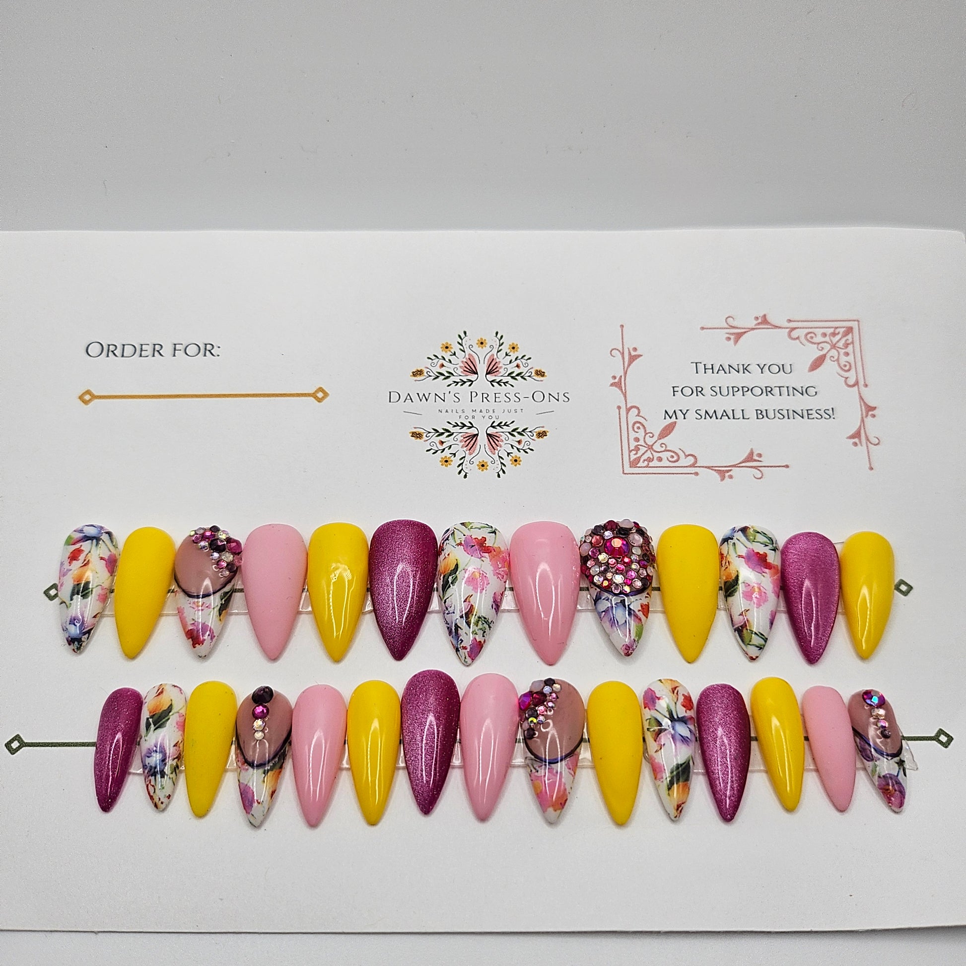 Tropical floral pattern with a deep pink cat-eye and yellow accent nails. This set pairs perfectly with tickled pink.